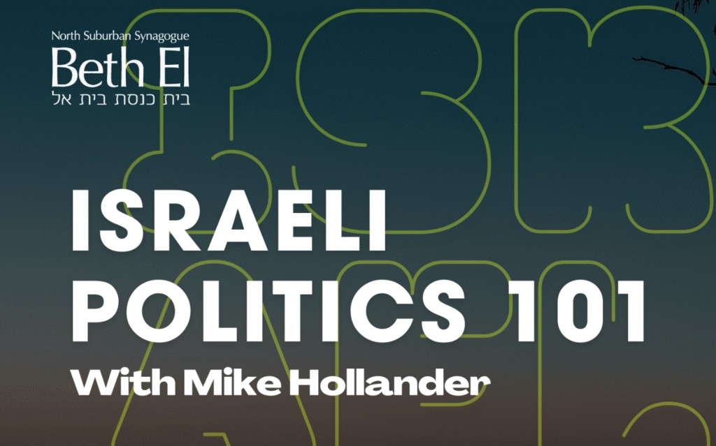 Mike Hollander, an experienced Jewish educator and licensed tour guide in Israel, will provide a fool-proof explanation of how the fragile and complicated Israeli political system works. Mike will join us on Zoom from Israel for this two-session series. Students can login together at Beth El (after HAZAK Fitness) or from the comfort of their own home. FREE!