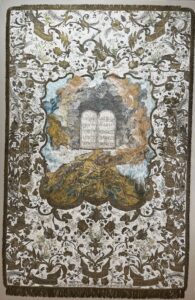 On August 20, 2023, Beth El dedicated the newly restored 18th century Italian Torah ark curtain, originally a gift to the collection by Badona and Maurice Spertus in 1962. This Torah ark curtain (parochet) is extraordinary because of its monumental size, masterful stitchery, and dynamic Baroque design. Encircled by a glory of clouds, the Tablets of the Ten Commandments burst forth to rest on Mount Sinai. Outlined in Rococo curves, the central medallion opens like a theater curtain to reveal the dramatic, visionary scene. Clouds surge over the top frame and heighten the explosive emergence of the Tablets. The silver thread of the gray clouds and bits of gold in the writing on the Tablets were likely plundered, perhaps by the Nazis. The lavish border of plants, flowers, and fruits reflects Italian botanical naturalism. Swirling vines and fanciful feathers in metallic bronze thread dance against the cream-colored silk background. Varied, intricate stitches form thick floral brocades, delicate leaves, and pastel flowers. Yellow pears grace the upper corners, red and black grapes nestle at the bottom. Along the bottom edge a Hebrew inscription dates the parochet and explains it was commissioned for an Italian synagogue in memory of Avraham ben Malach by his children: “In the year 1755 (5515 on the Hebrew calendar), a donation from the sons of the departed Avraham ben Malach. May he abide in Eden.”